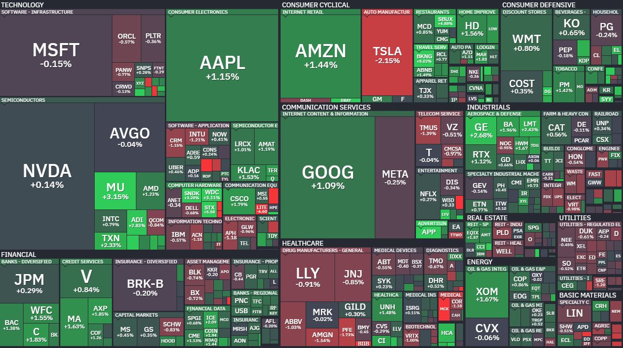 이번 상승은 헬스케어(-0.36%)를 제외한 전 섹터의 폭넓은 반등이었습니다. 특히 필수소비재(+0.94%)와 기술(+0.58%)의 강세가 눈에 띄었습니다.