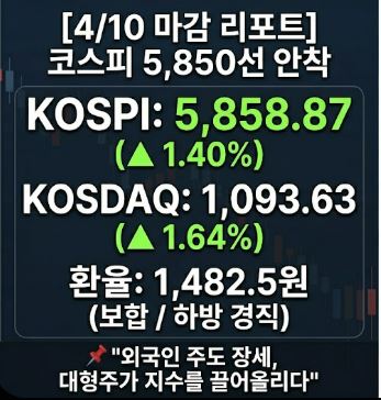 4월 10일 대한민국 증시는 주말 사이 예정된 미국과 이란의 대면 협상을 앞두고 강한 상승세로 마감했습니다. 코스피는 전일 대비 80.86포인트(1.40%) 오른 5,858.87을 기록하며 어제의 하락분(-1.61%)을 단숨에 만회했습니다. 특히 장 중 한때 2.43% 급등하며 5,918.59까지 치솟아 5,900선을 터치하는 등, 시장 내부에 잠재된 매수 에너지가 얼마나 강력한지를 여실히 보여준 하루였습니다.